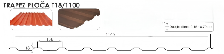Trapezni lim T18/138 ima srednju visinu vala (18 mm) i uski razmak valova (138 mm), što ga čini idealnim za: