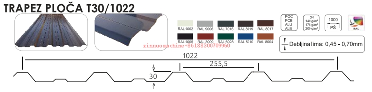 Xinnuo Roll Forming Machine Co., Ltd. specijalizirana je tvornica za proizvodnju opreme za hladno savijanje metalnih ploča s više od 30 godina iskustva. Naš Stroj-za-izradu-trapeznog-lima-T30/255,5, posebno razvijen za tržište Hrvatske i okolnih zemalja, visokoučinkovito je rješenje za industrijsku gradnju te krovne i zidne sustave skladišta.