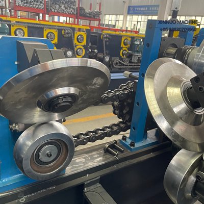 O chassi é soldado em aço tipo H, equipado com eixos de Ø75–85 mm e conjuntos de rolos em aço ferramenta Cr12, garantindo estabilidade, durabilidade e excelente acabamento do perfil.