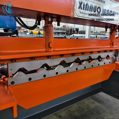 O sistema de corte é realizado por guilhotina hidráulica com dois cilindros, acionada pelo comando automático, complementada por faca de corte em aço VC131 tratada, faca de refilo para telhas sanduíche e faca slitter na mesa de entrada, permitindo troca rápida de bobina com segurança.